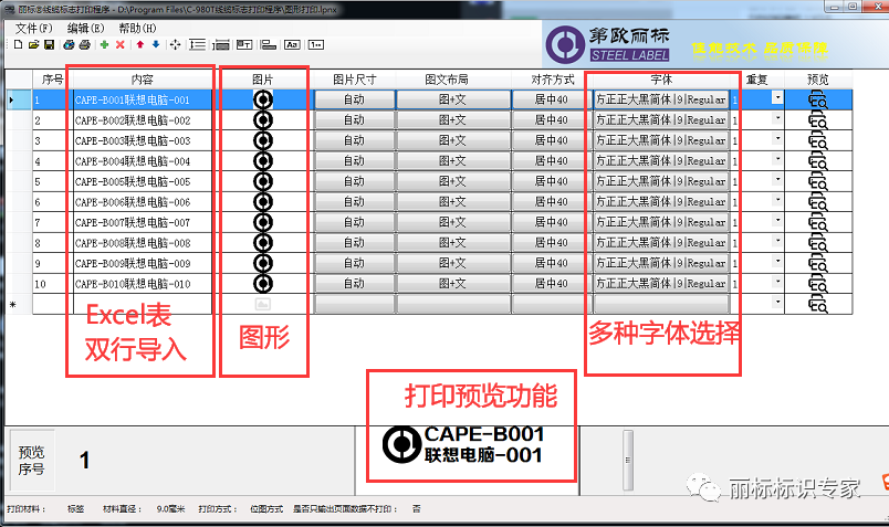 功能强大的PC端专用软件,支持Excel表双行导入、支持图形导入、多种字体可选。。。